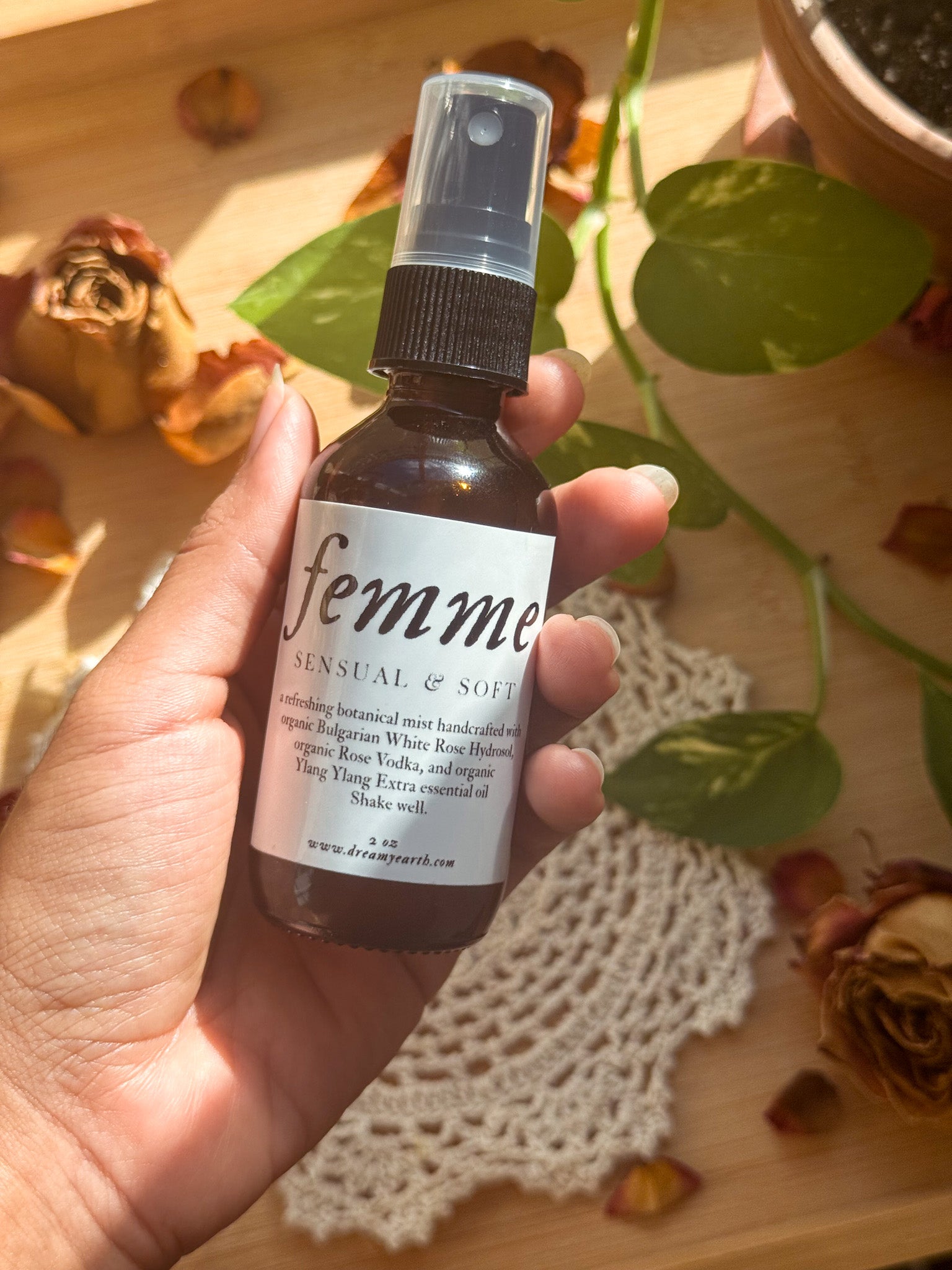 An ode to the feminine spirit. femme blends organic Bulgarian White Rose Hydrosol, organic Rose Vodka, and organic Ylang Ylang Extra essential oil into a lovely & refreshing mist that feels both tender and empowering