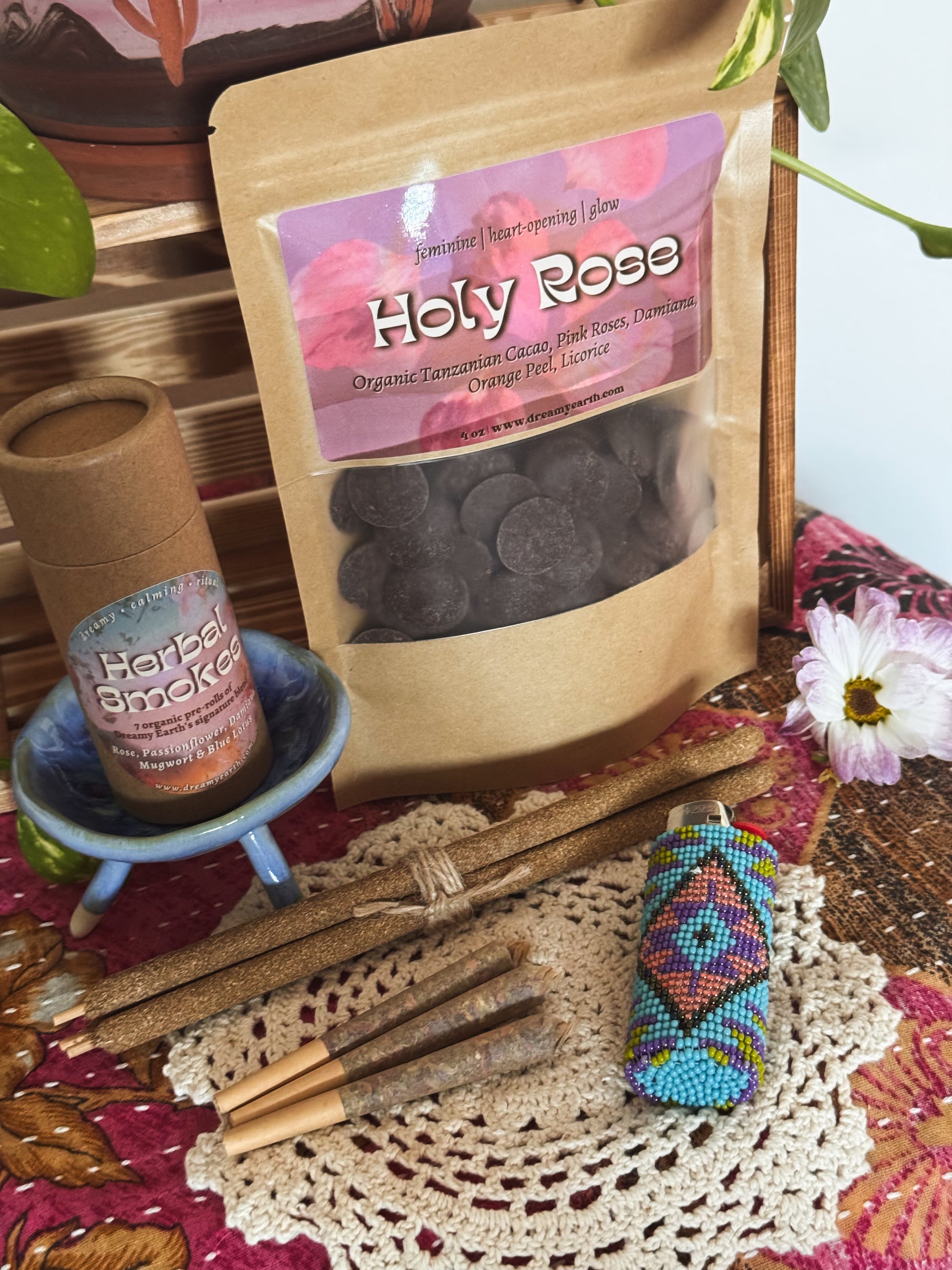 ⪼ Dreamy Earth OG Signature Blend Herbal Smokes (Pre-rolled): 7 pre-rolls of Dreamy Earth's signature sacred herbal smoke blend. This blend is a combination of dreamy and relaxing herbs: Passionflower, Mugwort, Damiana, Pink Rose Petals, and Blue Lotus.