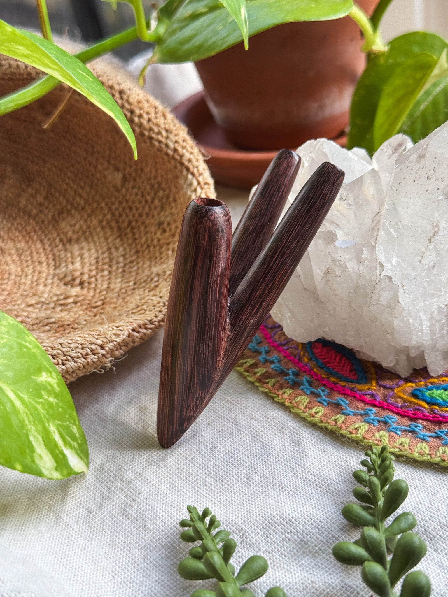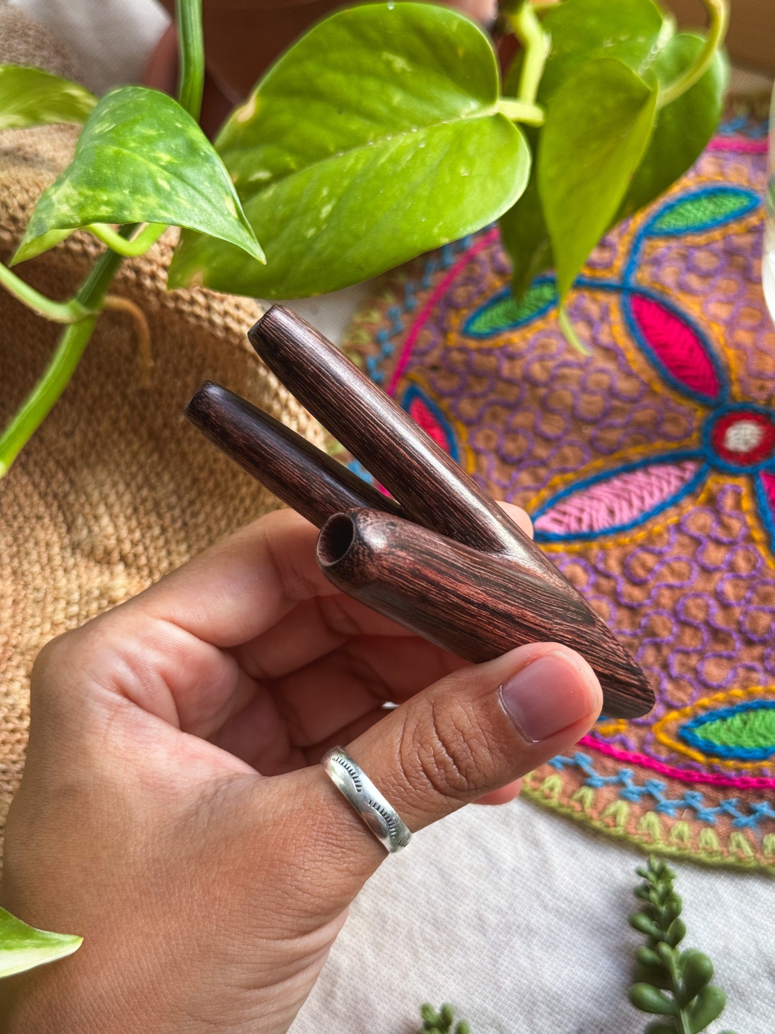 This double barreled kuripe is ideal for applying Hapé snuff into both nostrils simultaneously. Crafted with care by artisans in Bali, this kuripe is made of durable Tamarind wood and designed for long-lasting use.